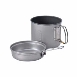 Snow Peak’s Aluminium Trek 1400 provides a 1.4L capacity pot with a lid that doubles as a small fry pan. Simple but effective folding handles keep the design compact while the minimalist style keep the weight down too. This set is ideally suited to campers aiming to keep weight down without sacrificing the capacity too much. The fry pan works well for small items such as eggs but is most often just used as a lid.